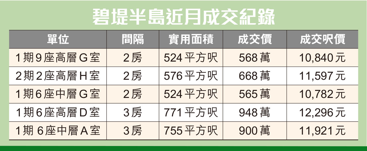 中原地產深井陳記商業廣場分行高級資深分區營業經理梁璟華表示,碧堤半島山景和海景單位實用平均呎價約11,780元,屋苑現時整體放盤單位約110至120個左右。