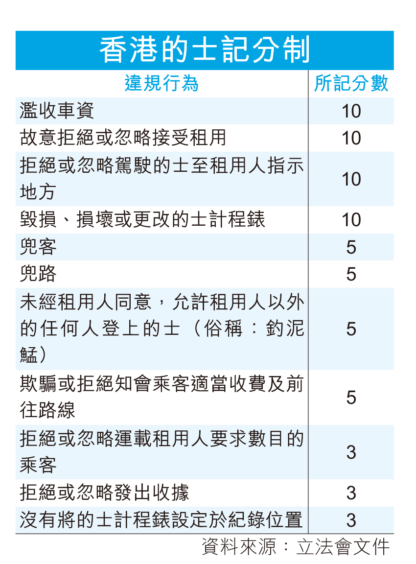 香港立法會昨三讀通過《2023年道路交通法例(提升個人化點對點交通服務)修例草案》。引入的「的士司機違例記分制」設11項記分準則(詳見附表),最嚴重的如濫收車費、毀損或更改的士計程錶將被記10分,而相對輕微的如拒發收據等則記3分。