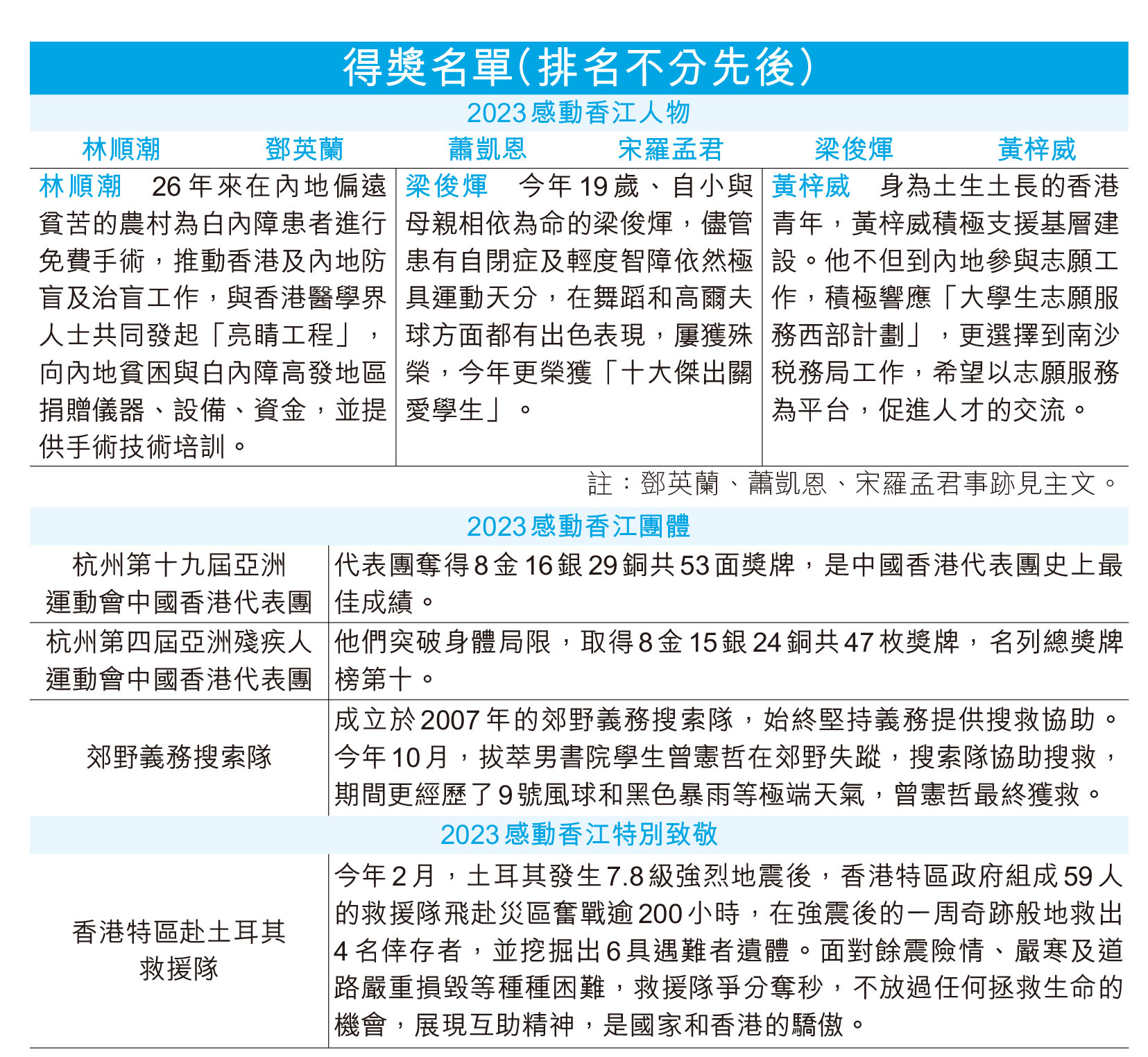 「2023感動香江」頒獎典禮昨在港舉行。大會共頒發了6位「2023感動香江人物」,3個「2023感動香江團體」,並向香港特區赴土耳其救援隊頒發了「2023感動香江特別致敬」獎。今次得獎者用實際行動寫下了感人的小人物大故事,更展現了港人大愛無疆、無私奉獻的精神。在頒獎典禮上,台下嘉賓也用一次又一次的熱烈掌聲向所有獲獎者致敬。