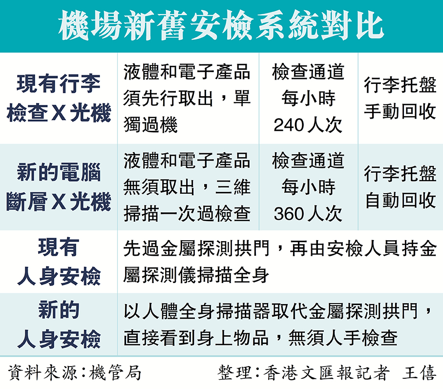 香港國際機場長期繁忙,第三跑道全面啟用後客流量將進一步增加。香港機管局耗資8億元引入全新智能安檢系統,包括以更大、更新式的電腦斷層X光機取代現有X光行李檢查機,可同時容許3名旅客擺放行李,行李內物品能快速產生三維影像、360度檢視。乘客日後無須再預先取出電子用品及液體,掃描時間亦由現時15秒縮短至10秒。安檢時亦以人體全身掃描器取代金屬探測拱門,無須再用人手持金屬探測器檢查。新系統於7月2日(下周二)起分階段投入服務,預計兩年內全面取代舊安檢系統。機管局表示,首階段會在南面及北面離境大堂安裝共4條新通道,每條通道同時可以容納3名旅客擺放行李,預計每條通道容量可由每小時240人次增至360人次,整體平均處理流量可增加20%。