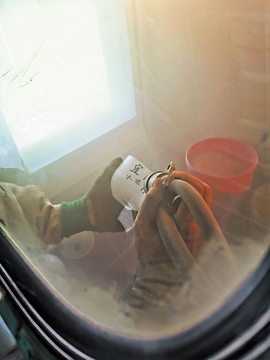 噴砂杯子的製作,體驗者首先要用紙巾將玻璃擦乾淨,然後噴上酒精,接下來就可以自行選擇貼紙貼上。館內提供約100種各式貼紙,你可以選擇自己喜歡的圖案進行拼貼,第一個原則是先貼大圖,再貼小圖;貼的時候也要注意貼在杯子較為平整的位置。」曾韋翔建議一次性將三張或以上貼紙剪下,以方便揭開與黏貼。不能用指甲摳,會摳很久,要慢慢剝白色這一面,然後將其對摺,它就會翹起來,然後再慢慢捲起、找到你喜歡的位置、壓一壓再撕開。如何製作磨砂部分?是將透明玻璃杯放入特製的櫃,將噴射槍噴射透明玻璃杯,沒圖案的地方就出現磨砂玻璃效果,噴砂過程因為涉及安全問題,通常曾老闆幫你弄。完成噴砂後將貼紙撕掉,就出現清晰圖案,你就享受作品出爐的喜悅。