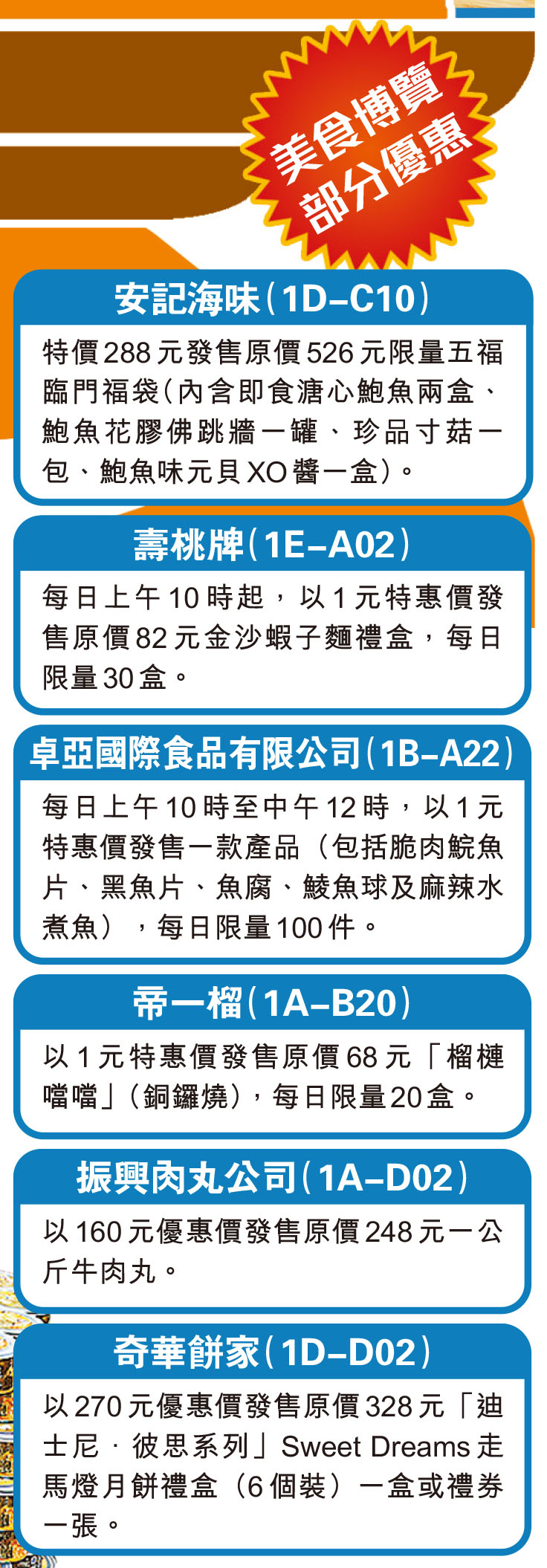 美食博覽下周四(15日)起一連五天於灣仔會展舉行,逾700家展商參與,同期並舉辦美與健生活博覽、家電·家居博覽、美食商貿博覽以及香港國際茶展。貿發局指5項展覽匯聚逾1,840家展商且內容豐富,加上交通配套齊全,配合大灣區一小時生活圈,料吸引大批內地旅客來港消費。為吸引更多人入場購物,各展商除推優惠產品外,向以「1蚊鮑魚」遊戲招徠的安記海味更首設現場熟食,以鮑魚花膠吸客;有本地肉丸品牌則設置上世紀於九龍城寨打丸情景供打卡,並不停供應免費試食宣傳。