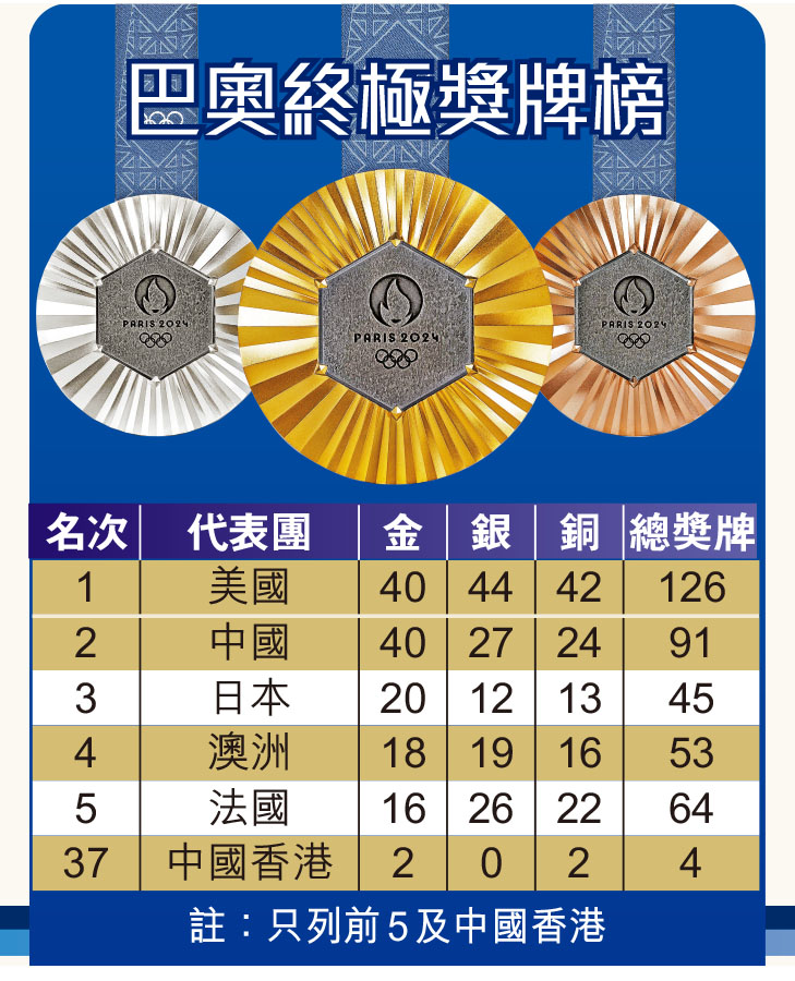 在今屆巴黎奧運初段,中國在金牌數目上大部分時間佔先,不過當進入中段自田徑項目開始,美國發揮他們的傳統優勢,勁贏14面金牌,即時將差距縮減再反超。不過,中國在奧運上勝在發展平均,多個項目都能拿下金牌,尤其跳水、乒乓球、舉重及射擊都佔有極大優勢,最終與美國在金牌榜平分秋色,展現出當今體壇最強王者實力。
