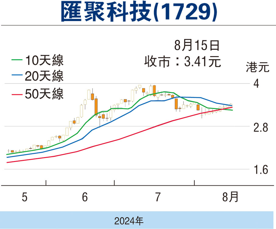 此外,匯聚宣布近日中標江西吉安縣城北二中報告廳設備採購項目,金額1,874,682元人民幣。匯聚昨收報3.41元,升4仙或1.8%,成交653萬元。該股自7月中旬發布盈喜前後,股價由2.75元升上3.95元,創上市以來新高,其後回調至近日3.15元獲承接, 有上試高位之勢。