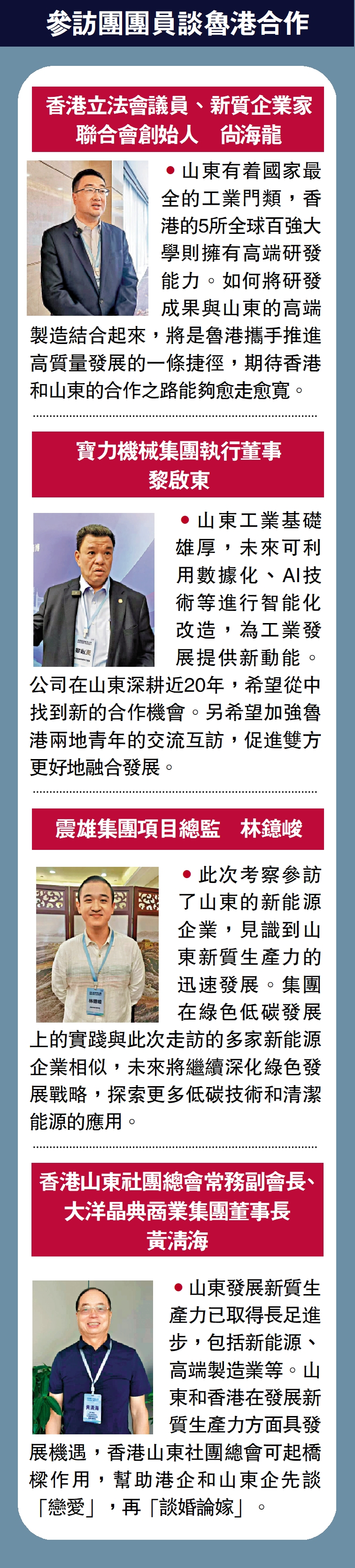 •山東發展新質生產力已取得長足進步,包括新能源、高端製造業等。山東和香港在發展新質生產力方面具發展機遇,香港山東社團總會可起橋樑作用,幫助港企和山東企先談「戀愛」,再「談婚論嫁」。