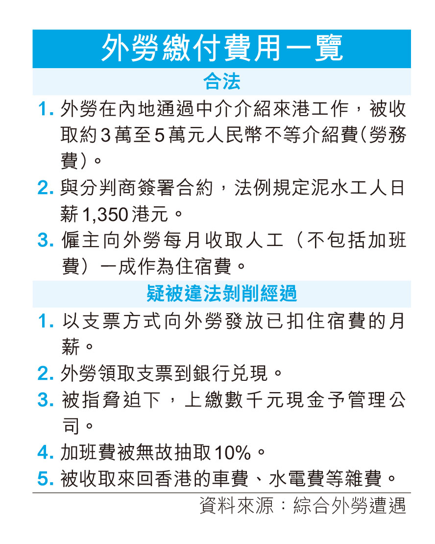 外勞被剝削風波愈演愈烈,30多名聯合醫院重建項目的外勞忍無可忍,昨日發起罷工行動,管理公司即晚表示解僱他們,其後有傳分判商澄清無須理會管理公司的話。本報獨家追訪多名外勞,揭露他們每月以支票出糧,兌換成現金後,被所入住的深圳宿舍管理公司,脅迫他們以現金上繳費用,以及濫收各類雜費,否則炒魷。工資被層層壓榨後,只剩五六成。記者深入調查發現,該管理公司非香港公司,不受香港法例監管,香港建造業總工會權益及投訴主任吳偉樑促請香港特區政府與深圳聯手調查事件,打擊不法行為。
