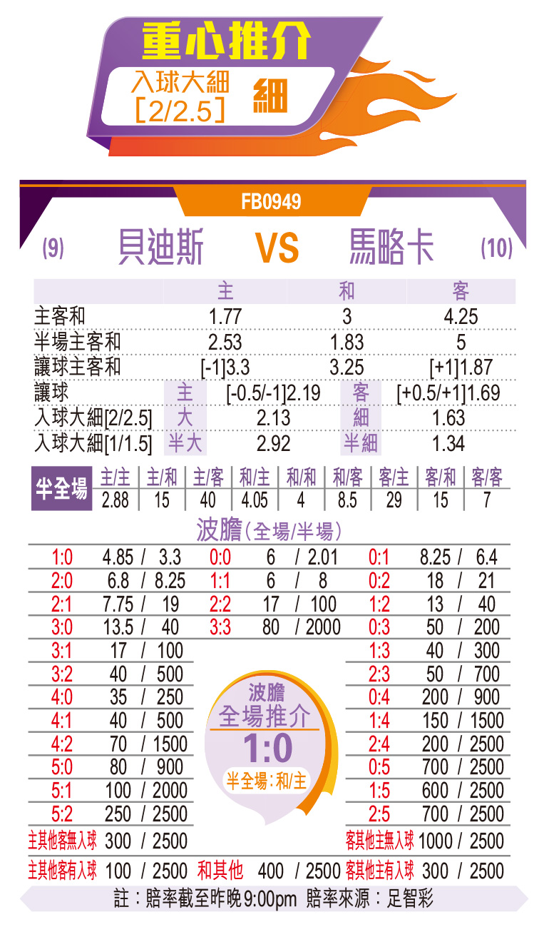 西甲第6輪壓軸戲,貝迪斯主場迎戰馬略卡。兩支積分相同實力接近球隊對決,雙方目前都面對陣容不整、鋒力嚴重不足問題。不過兩軍今季防線同樣有好表現,開季至今於西甲只各失4球。今場勢均力敵下,預期一如近仗對賽再合演拉鋸戰。貝迪斯即使有主場亦可勝不穩,寧吼[2/2.5]細盤。(NOW 632台周二3:00am)