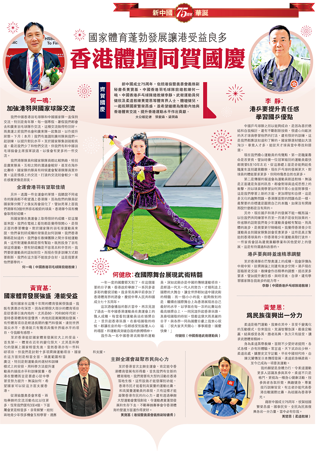 新中國成立75周年,包括港協暨奧委會義務副秘書長黃寶基、中國香港羽毛球隊前總教練何一鳴、中國香港乒乓球隊總教練李靜、武術運動員何健欣及柔道教練黃楚恩等體育界人士、體壇健兒,一起祝願國家繁榮昌盛,並希望繼續為推動內地與香港體育交流、提升香港運動水平作出貢獻。\大公報記者 張銳森、梁潤森