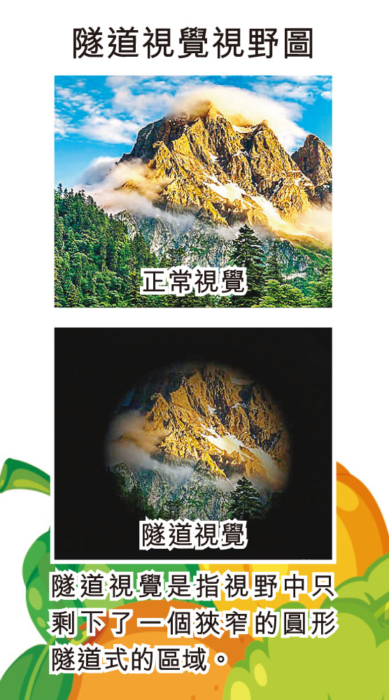 當夜盲症病情日益發展,漸漸的病變部分會變大,並向中央蔓延,除了夜間的視力惡化外,也會開始引發更明顯的症狀,常見會造成周邊視野逐漸變狹窄──「隧道視力」(Tunnel Vision)。即視野像在隧道內往外看般,四周黑漆漆,只有正中央、有光線的地方才看得到。病情發展到最後,患者就會有失明的危險。