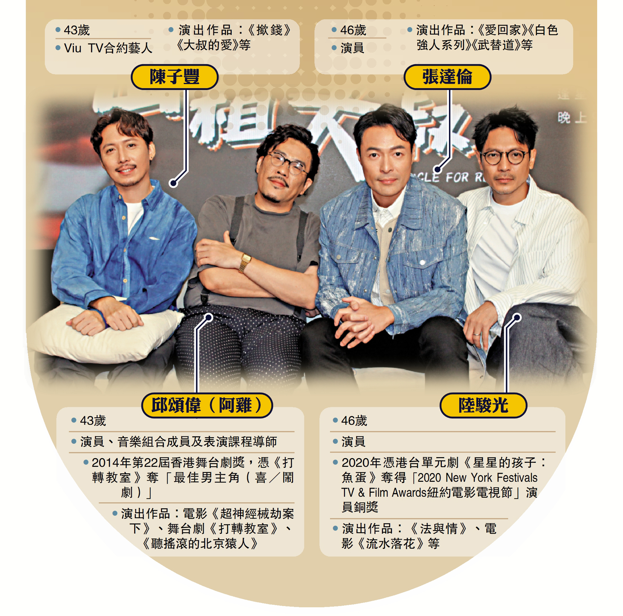 近年常聽到不少人探討「中年危機」的問題,究竟何謂「中年危機」?多少歲才算「中年大叔」?已年過40的男演員陸駿光、陳子豐、張達倫和邱頌偉(阿雞),最近便以嶄新的組合合作拍攝ViuTV原創劇《出租大叔》,齊齊成為「出租達人」,幫助都市人解決疑難,從中找回在「中年危機」中的自我價值。提起「中年危機」,四位演員各有看法,表示不止女演員有年齡關口,男演員都會有踏入中年的衝擊。\大公報記者 溫穎芝(文、圖)