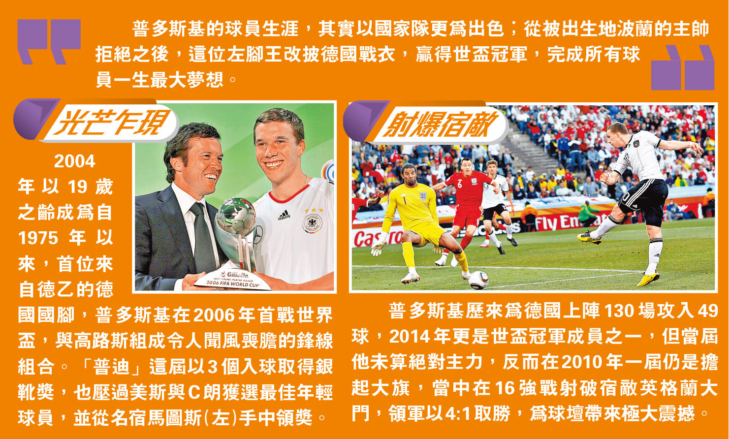 球員生涯獲獎不少,2014世盃冠軍是他的最大成就,也曾在2006年榮膺世盃最佳年輕球員,由18歲代表科隆完成個人德甲首騷,經過21年後,普多斯基終於告別:「球場上一切終於完喇,但我好肯定喺球場外仲會見到大家。咁多人嚟陪我度過呢個特別晚上,真係令我好感動。再次着起科隆波衫係我嘅榮幸,亦係我對呢個城市、球迷以至多年陪伴住我嘅隊友,最後一次表達對大家嘅愛。」