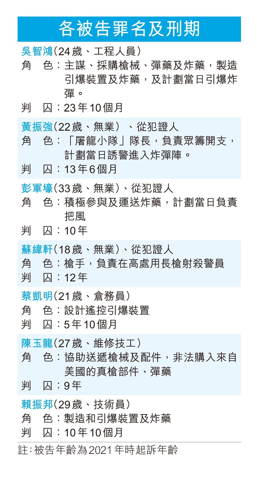 7名被判刑被告分別為吳智鴻、黃振強、彭軍壕、蘇緯軒、蔡凱明、陳玉龍及賴振邦。他們面對不同控罪,其中吳、黃、彭承認律政司首度引用《聯合國(反恐怖主義措施)條例》下串謀犯對訂明標的之爆炸罪。蘇、蔡、陳分別承認串謀謀殺、協助及教唆製造爆炸品及串謀無牌管有槍械等罪,賴則受審後被裁定屬交替控罪的串謀導致相當可能會危害生命或對財產造成嚴重損害的爆炸罪成。黃、蘇及彭亦作控方從犯證人出庭作供。