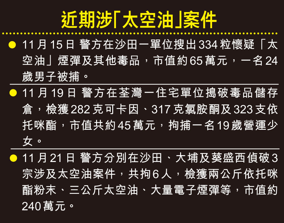 採用「依托咪酯」為主要成分的「太空油」對社會影響日深,尤其是對年輕人造成禍害。香港海關於本月展開連串特別執法行動,成功搗破兩個依托咪酯分銷中心及一個「太空油」煙彈儲存中心,並以涉嫌「管有第一部毒藥」等罪拘捕7人,包括一名小學教師。海關又於8個印度空運抵港包裹檢獲共16公斤依托咪酯粉末,以及在多處搜獲191粒「太空油」煙彈,是海關首次截獲以空運偽報方式進口依托咪酯案件,料市值1,700萬元。