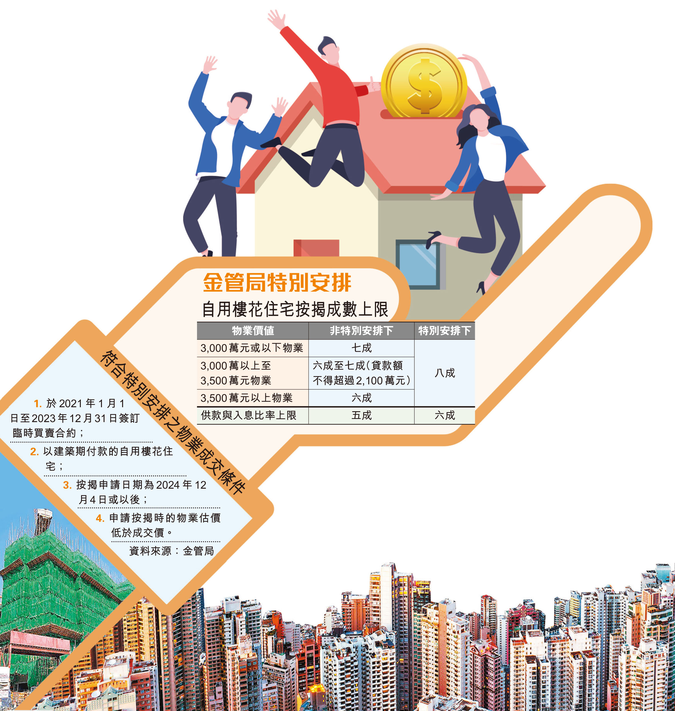 金管局昨向銀行發指引,推出一次性特別安排以協助於樓市高位以建築期付款購入樓花住宅物業的用家,是次特別安排涵蓋於2021年1月1日至2023年12月31日,簽訂臨時買賣合約並且以建築期付款的自用樓花住宅物業,而有關物業的按揭申請日期為昨日(4日)或以後。此外,申請按揭時的物業估價須要低於成交價。金管局提醒,由於每間銀行的按揭條款不盡相同,合資格申請人如有需要或疑問,適宜盡早向有提供特別安排的銀行查詢。