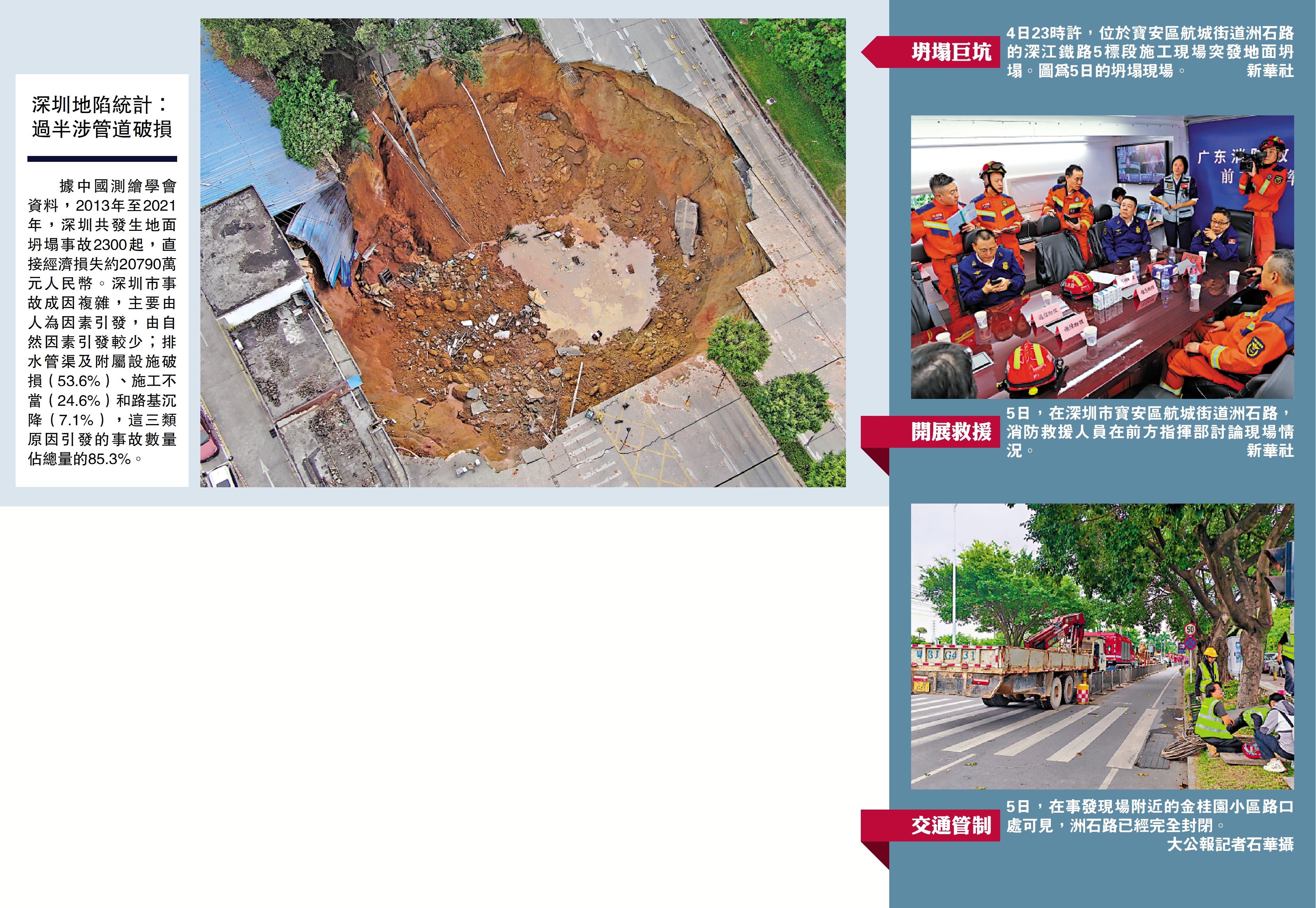 4日23時許,深圳市寶安區航城街道洲石路的深江鐵路5標段施工現場突發地面坍塌,13名現場作業人員失聯。事故發生後,廣東省與深圳市相關部門合力連夜推開各項救援工作,廣東省政府亦成立了事故調查組,目前事故原因正在調查中,現場多部門開展救援處置工作。應急管理部5日也已派出工作組趕赴現場。