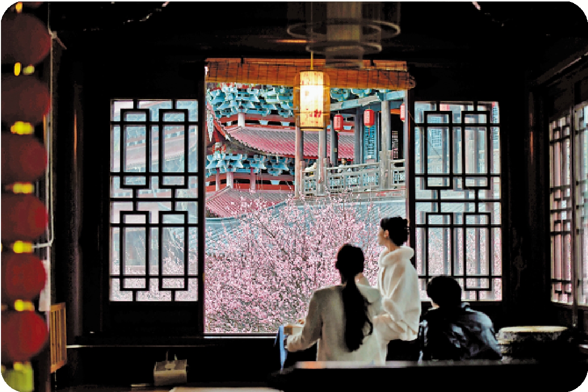 每年冬季,尤其是春節期間,福建福州林陽寺的梅花盛開,吸引了大量遊客和攝影愛好者前來賞梅。圖為遊客於林陽寺窗前賞梅。\中新社