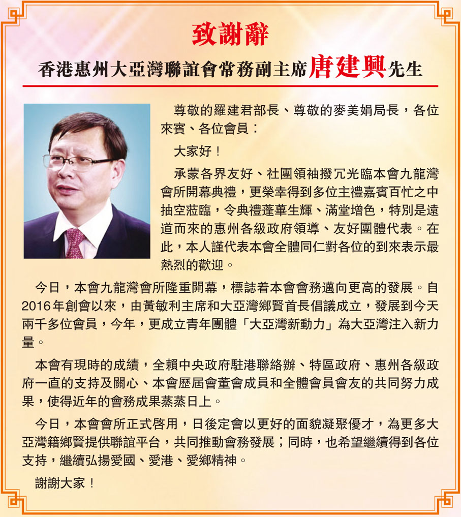 承蒙各界友好、社團領袖撥冗光臨本會九龍灣會所開幕典禮,更榮幸得到多位主禮嘉賓百忙之中抽空蒞臨,令典禮蓬蓽生輝、滿堂增色,特別是遠道而來的惠州各級政府領導、友好團體代表。在此,本人謹代表本會全體同仁對各位的到來表示最熱烈的歡迎。
