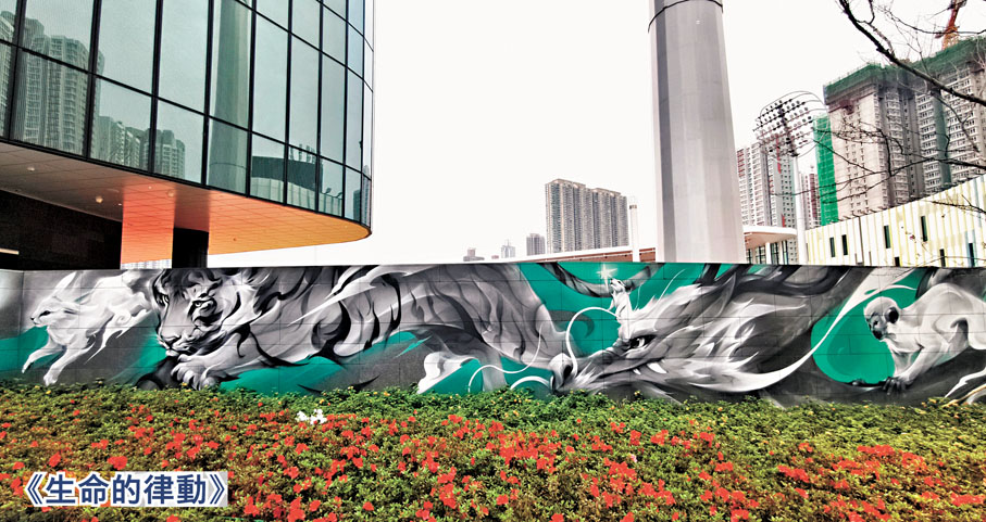 運動健康中心外的噴漆作品《生命的律動》由廣州年輕藝術家Satr繪製,靈感源自十二生肖。藝術家已涉足街頭藝術十餘年,擅長使用噴漆霧化技術使動物輪廓帶有煙燻感。Satr亦善用墨水,在西方塗鴉的大膽與東方繪畫的細膩筆觸間實現平衡。