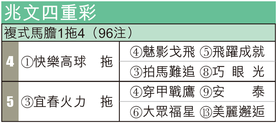 第四場第四班1200米。「快樂高球」上季首兩戰表現不俗,第三戰跑1400變陣搶放,迅即坐正輕勝兩個馬位,再出增磅放出唔第三,以為今季轉四歲可扶搖直上,誰不知首仗入位後無以為繼。羅富全變招,早前安排「快樂高球」抖兩個月,而且大幅度縮程改攻1000,同時替牠加上眼罩,雖仍未能再啟勝門,但三戰俱獲亞表現不差,而三場頭馬「綫路盈樂」和「時時歡欣」,之後再出繼續有好表現,上仗「超力量」更是超級馬,落敗非戰之罪。「快樂高球」今次再抖個半月,同時改動配備轉用開縫罩,並轉爭1200,擺到明要故技重施,也有望替牠爭取新鮮感。