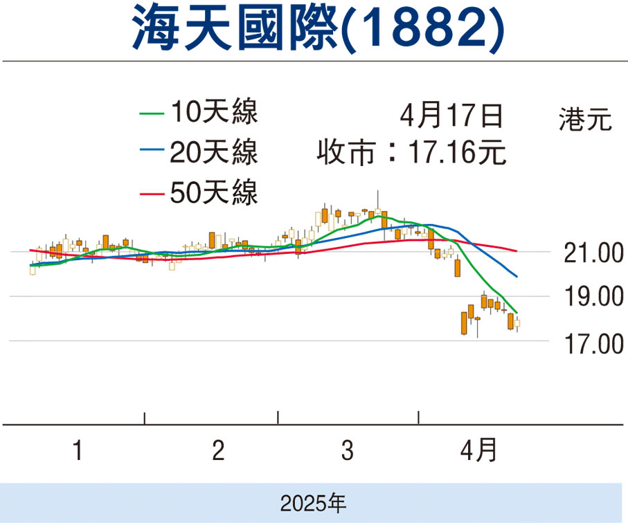 海天昨收報17.16元,升0.48元或2.87%,成交6,420萬元。現價市盈率8.36倍,息率4.25厘,市淨率1.25倍。現水平估值吸引,可收集博反彈,上望21元。