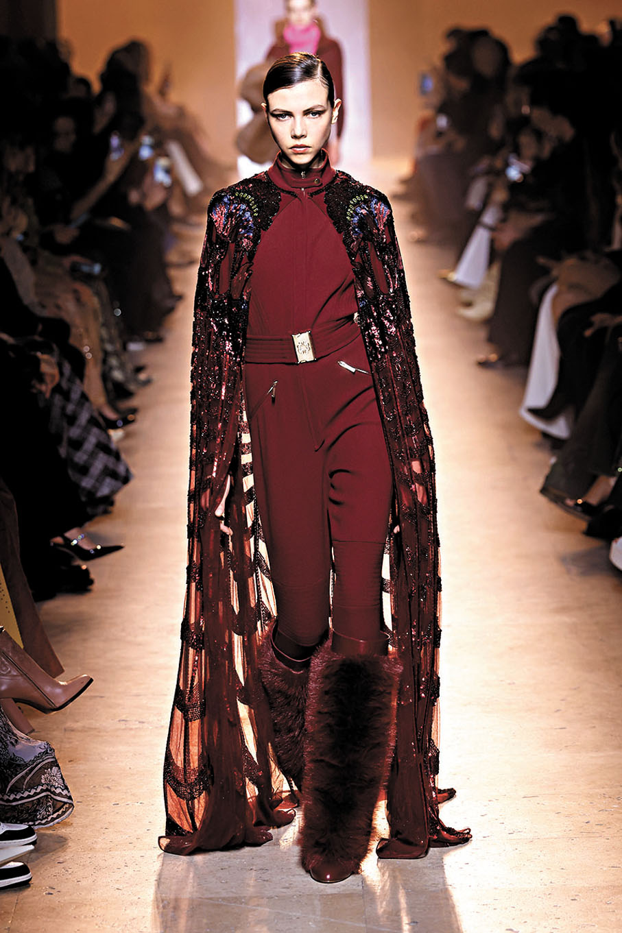 Elie Saab的秋冬系列以奢華與自然的結合為主題,展現品牌一貫的優雅與創新。這次設計靈感源於冰雪世界,運用了豐富材質如絲綢、蕾絲和珠飾,打造出如月光下冰川般的波浪效果。系列中特別突出了結構化的絲綢緊身胸衣,搭配層疊珠飾的長禮服,營造既精緻又夢幻的氛圍。此外,配件如阿拉斯加風格的帽子、毛皮鑲邊雪地靴和遮陽面罩,為整體造型增添活力與趣味。系列還巧妙地將運動與奢華融合,創造出既實用又充滿魅力的設計。
