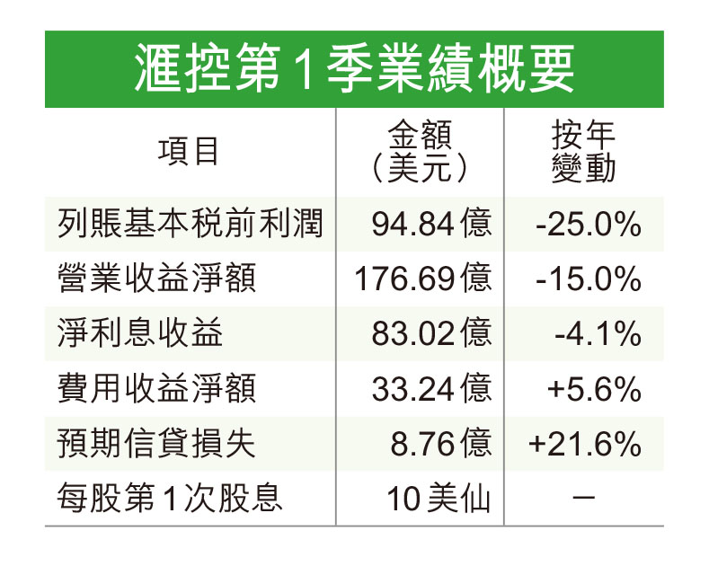 滙控(0005)今年首季列賬基準稅前利潤94.84億元(美元,下同),按年跌25%,仍勝市場預期。主要受累去年同期出售加拿大銀行業務,以及阿根廷業務相關的37億元淨影響不再出現。該行亦擬展開最多30億元(美元,下同)回購股份計劃。對於地緣政治不穩,衝擊不同企業業務,集團行政總裁艾橋智昨表示,即使在惡劣情況下,對營業收入影響輕微。並相信全球化不會完結,亦留意到貿易環境開始轉變。