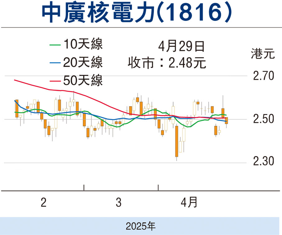 中廣核昨收報2.48元(港元,下同),跌3仙或1.19%,成交1.05億元。現價市盈率10.89倍,息率4.07厘,市淨率0.99倍,估值不貴,且近2.3元支持區,可分段收集,上望2.8元。