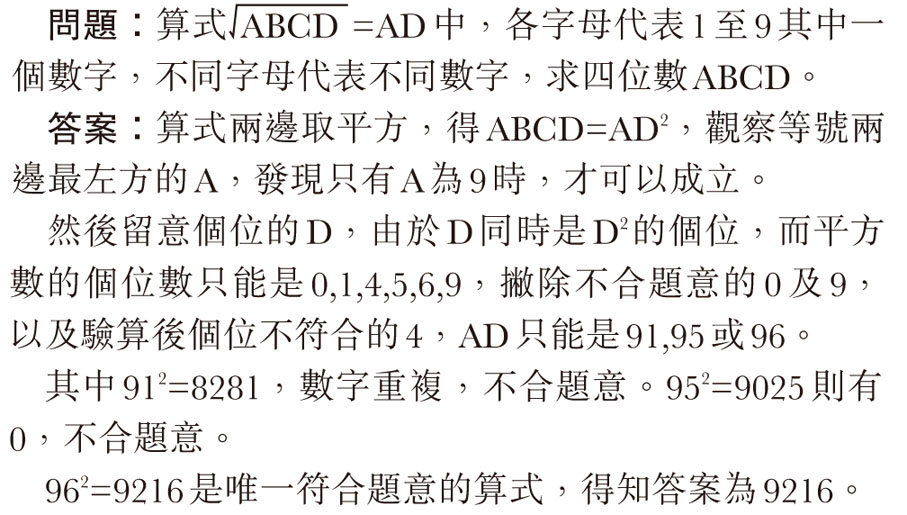 例如,剛才出的題目AD²=DBCA,也會知道右方的A是平方數個位,可能是1,4,5,6或9,之後就可以代入左方的A再驗算,然後做些推論和探索,看看能不能找到能配合的D,作為右方的千位數。