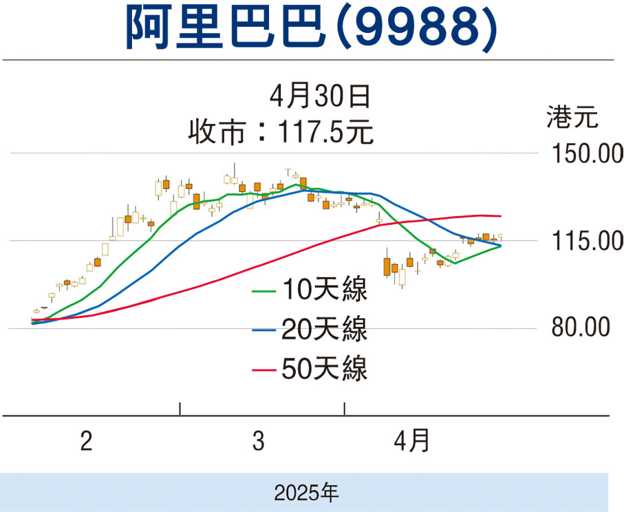內銀首季業績遜預期,拖累板塊昨日受壓,惟權重科網股造好,則對大市構成支持。事實上,作為國指、科指及恒指三大指數成份股的阿里巴巴(9988),股價昨日便走高117.5元報收,升2.5元或2.17%,現價已持穩於多條重要平均線上。在消息面利好下,料阿里後市的上升空間仍有望擴大。