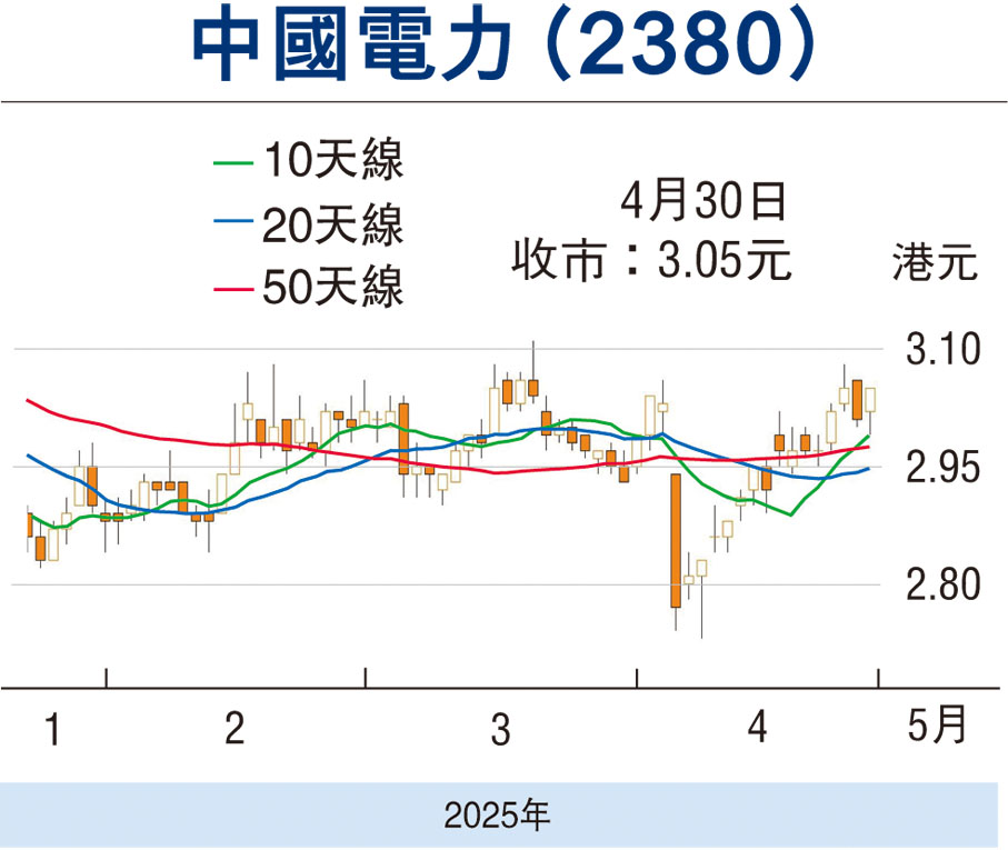國家能源局數據顯示,今年首季全國全社會用電量近2.4萬億千瓦時,按年增加2.5%。隨着人工智能(AI)興起,生成式AI被進一步採用,市場預期耗電量將進一步提升。另外,夏季臨近用電量將增加,而且煤價近期回落亦有利電企降低成本。中國電力(2380)以火電業務為主要收入來源,同時加快轉型至新能源,清潔能源裝機容量比例逐漸提高。