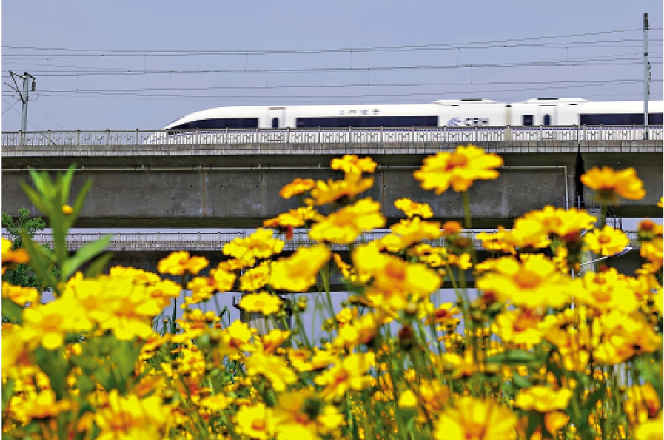 初夏時節,安徽省黃山市徽州區西溪南鎮鄉村道路旁的金雞菊花漸次綻放,扮靚徽州田園風景。圖為列車從金雞菊花海旁經過。\中新社