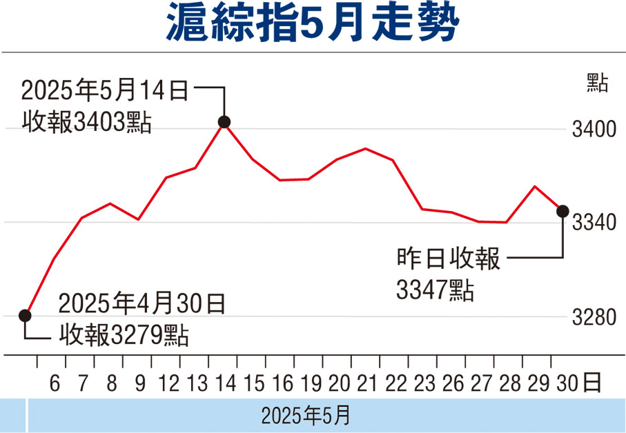 香港文匯報訊(記者 章蘿蘭 上海報道)近期A股行情反覆,前日短暫回升後,昨日主要指數再度下探,滬綜指跌0.47%,深成指跌0.85%;創業板指跌0.96%,落於2,000點下方。不過,整個5月仍有「進賬」,期內滬綜指累升2.09%,深成指累升1.42%,創業板指累升2.32%。