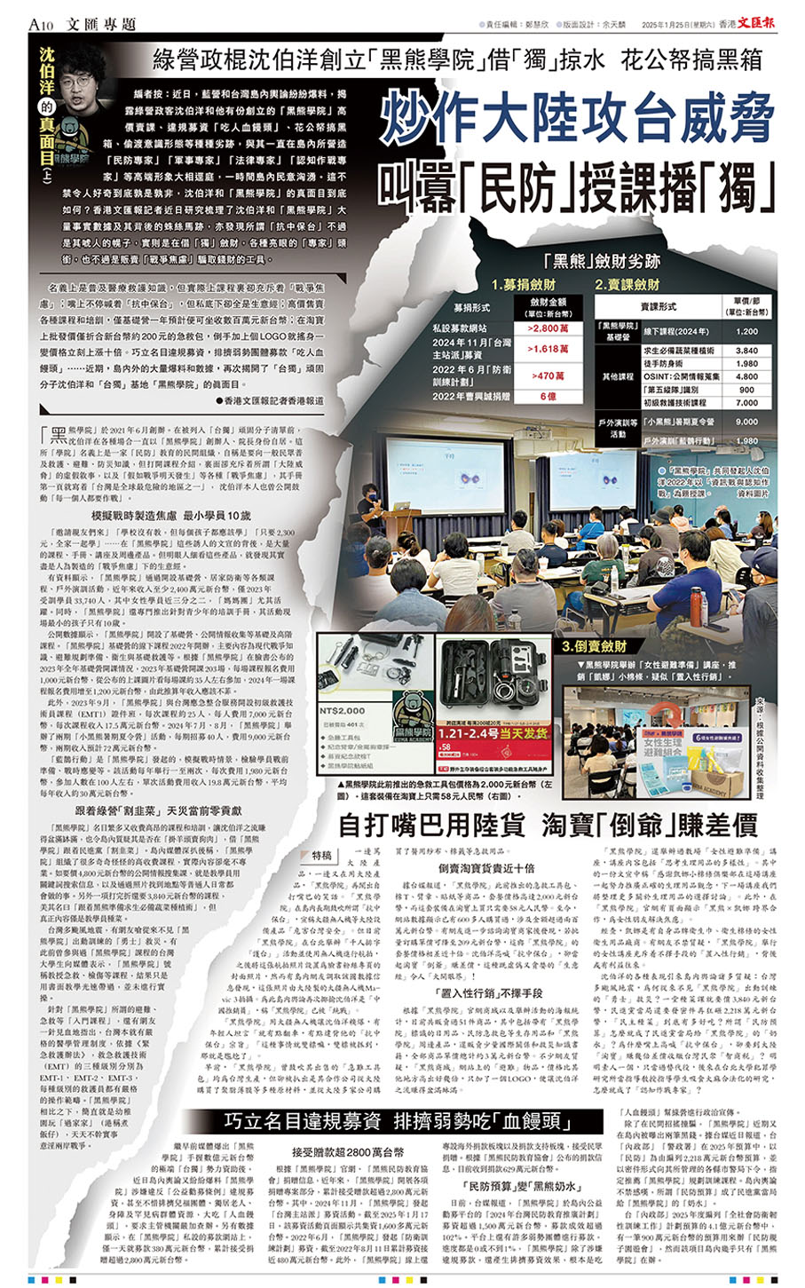 今年1月,香港文匯報記者曾通過研究和梳理大量事實與數據,揭開沈伯洋及「黑熊學院」販賣「戰爭焦慮」、借「獨」斂財的真面目。如今,僅僅過去四個來月時間,又一堆沈伯洋和「黑熊學院」的新醜聞公諸於眾。種種奇葩、反智言行再一次撕下「台獨」頑固分子沈伯洋和「台獨」基地「黑熊學院」的虛偽假面具,進一步暴露了其假借「抗中保台」騙財騙選票的醜陋嘴臉。●香港文匯報記者香港報道