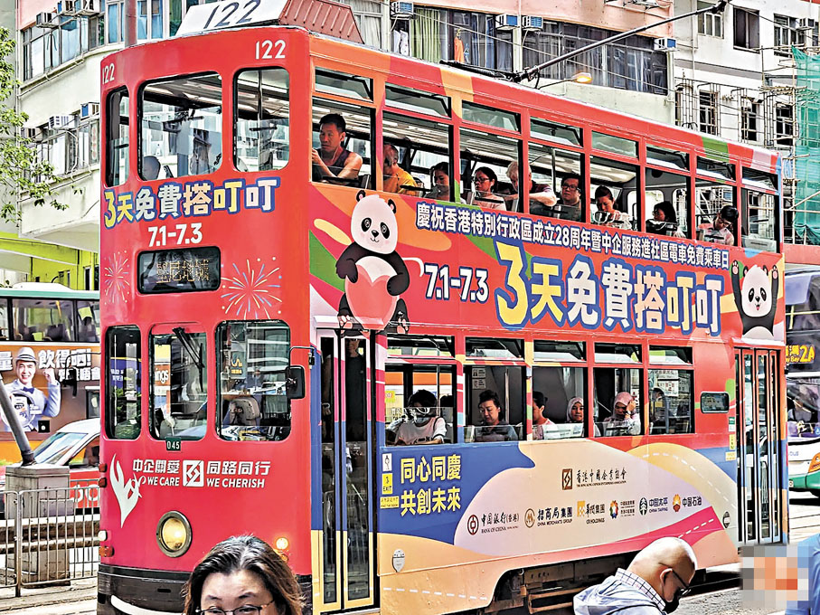 今年是香港回歸祖國28周年,香港中國企業協會舉行慶祝香港特別行政區成立28周年暨中企服務進社區電車免費乘車日,邀請市民和來港遊客於7月1日至3日期間,一連三日免費搭電車(叮叮車)。昨日所見,不少運營的電車車身已貼上相關宣傳標語。●圖:大公文匯全媒體記者