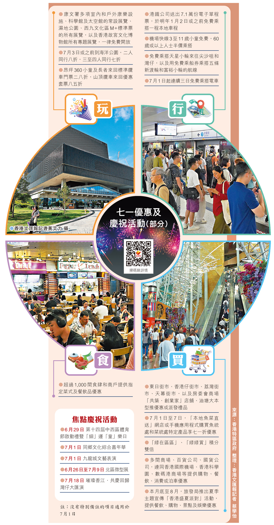 今年有更多企業推出七一優惠,包括多間商場、百貨公司、國貨公司,連同香港國際機場、香港科學園、數碼港商場等,提供一系列購物、餐飲、消費或泊車優惠。在6月底至8月,香港旅遊發展局與多個商戶合作,推出餐飲、購物、景點、旅遊和娛樂優惠,讓市民和遊客玩得盡興。