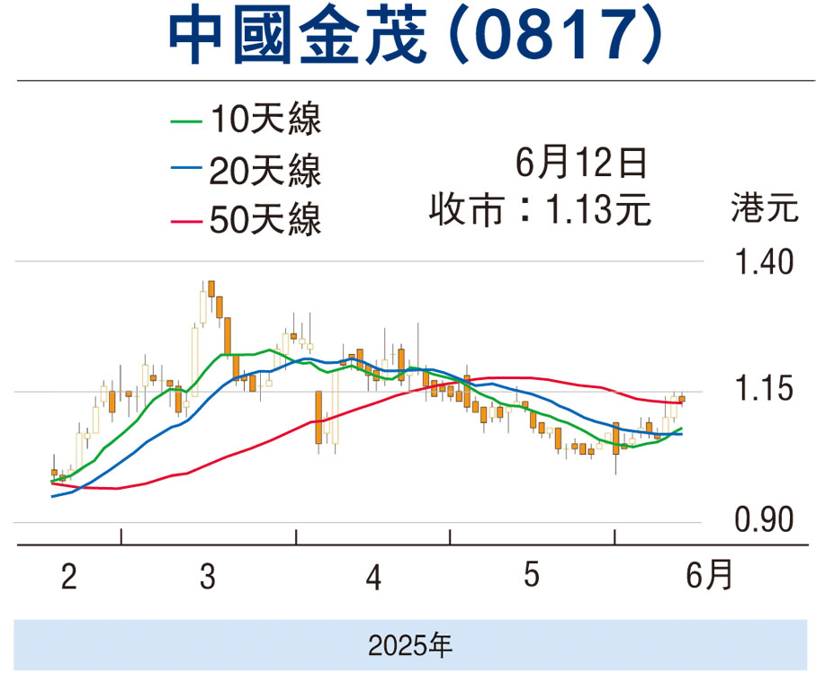 金茂昨天收報1.13元,微跌1仙,成交4,990萬元。該股過去兩個月自0.99元築底反彈至1.16元,近日走勢呈黃金交叉,有利延續回升。現價市盈率20.4倍,預測10倍,可收集,上望1.36元。