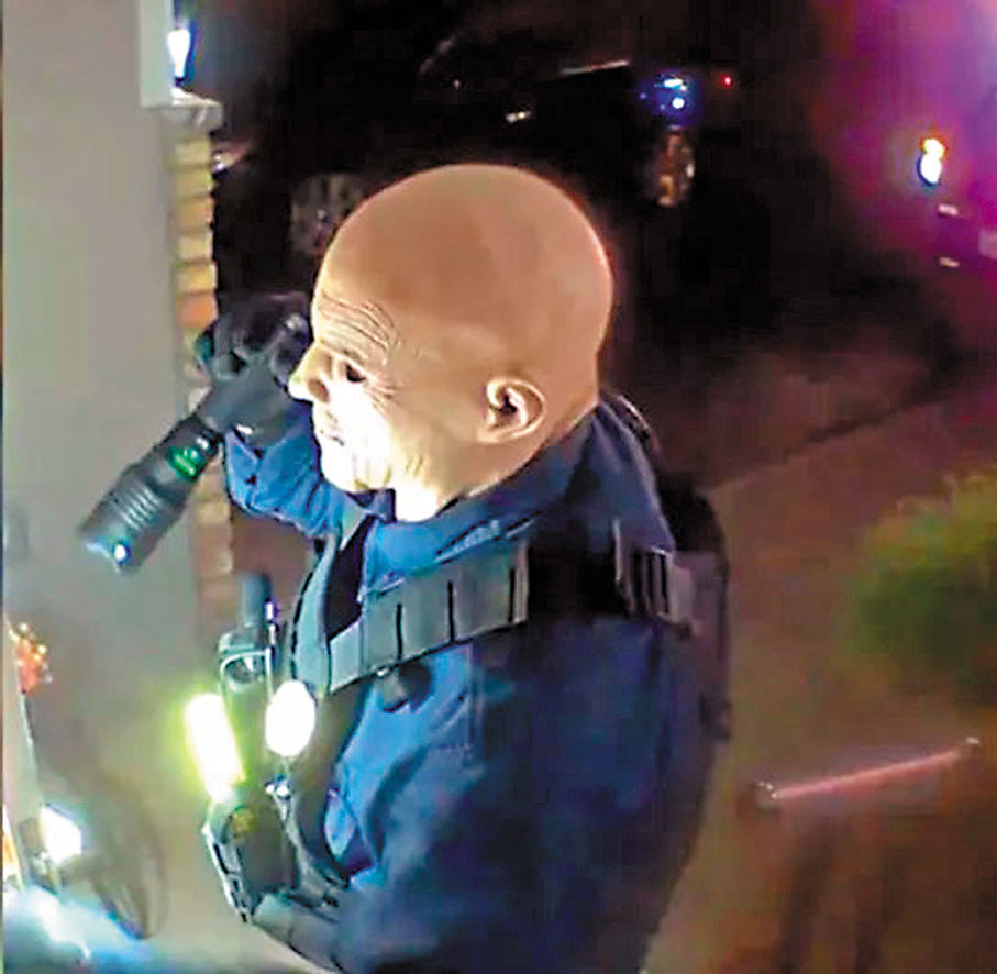 FBI刑事偵查局局長埃文斯稱,57歲疑犯博爾特(圖)行兇時身穿黑色防彈衣和藍色襯衫,涉嫌冒充執法人員入屋行兇,指此案是一宗針對公職人員的故意襲擊。警方公布博爾特穿着疑似警服,頭戴乳膠面具,準備入屋犯案的閉路電視畫面。