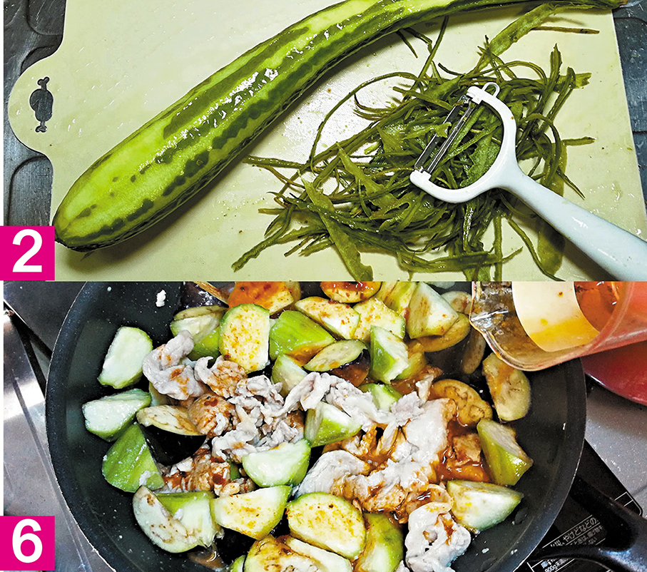 6. 將肉色轉白的薄切豬肉推向鑊周邊,將切妥的勝瓜及茄子置入鑊中央,注入調味,蓋上鑊蓋,大火加熱約1分鐘;