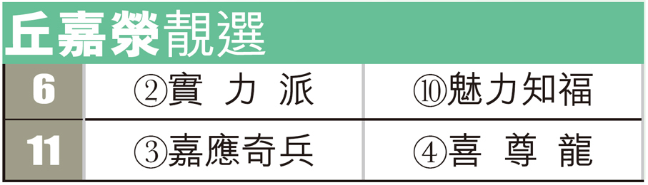 賀賢今季運氣麻麻,頭馬數字明顯比過往幾季為少,不過嚟到季尾馬房開始發力,近兩個月頭馬雖然唔多,但10倍或以下馬匹上名率超過四成,今期手馬亦似配合而來,尾場有新勝馬「嘉應奇兵」,希望爭取連捷;同日仲有降班嘅「實力派」。