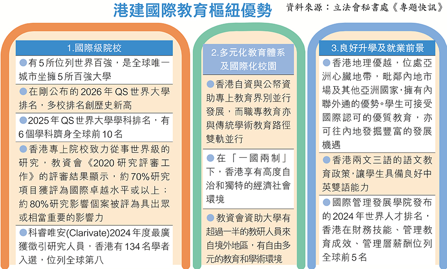 立法會秘書處昨日發布最新一期《專題快訊》,主題是「建設國際教育樞紐」,扼要介紹香港教育的競爭力、發展國際教育樞紐的獨特優勢,報告總結出建設國際教育樞紐的五大好處,以及特區政府推出一系列政策助香港達成願景。有立法會議員認為,要做到「樞紐」的目標,教學和研究均須持續向高質量推進,政府可考慮為專上院校制訂關鍵績效指標(KPI),以提升教學和研究水平,從而吸引更多非本地學生。