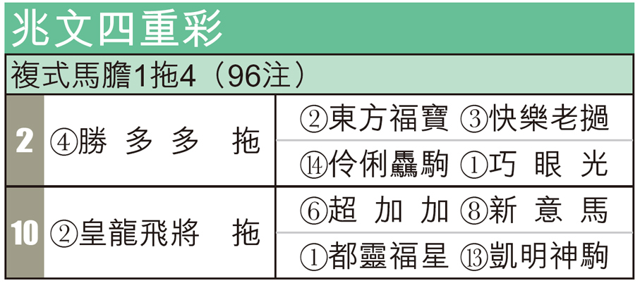 第十場第三班1650米泥地。「皇龍飛將」今季首三仗每戰都改動配備,顯示當時仍有好多不足,故三戰草地全部無影。第四仗開始改攻泥地追勢好,之後兩戰繼續跑泥地1200都交出頭馬。