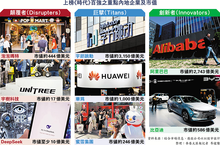 《時代》雜誌的影響力100強企業榜單,劃分五大組別,分別為顛覆者(Disrupters)、創新者(Innovators)、領導者(Leaders)、巨擘(Titans)及先驅者(Pioneers)。於2025年的榜單中,顛覆者包括泡泡瑪特(9992)、DeepSeek與宇樹科技;創新者包括阿里巴巴(9988)與比亞迪(1211);至於巨擘則有蜜雪集團(2097)、字節跳動與華為。