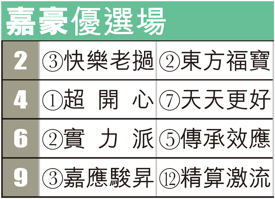回顧「超開心」插班首仗跑谷草1200米,同場有「年少多好」與「天足貓」在,牠出閘第四快,只是「綫路盈樂」被催策跟上前,鍾易禮則按韁讓馬兒從容居於中遊而已。以此推算,假使今戰被指示盡量跟前,在根本無幾多匹快馬同場之下,預料「超開心」並不難做到。