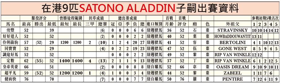 降班前先輸場泥地,而且刻意用留後跑法,食飽沙後毫無走勢,根本不反映甚麼,反而之前一役角逐1650米,「超開心」全程跟住「勝意」跑,比後駒僅落後兩個身位過終點,那場馬屬超快步速賽事,由「銀進」一條直路從尾殺上贏馬,則以僅三歲多點的「超開心」而言,這成績已經遠比紙上亮眼。今回落班與大群主要屬同歲對手改戰短途,假如你覺得「勝意」可以較「合夥飛馳」為佳,則「超開心」亦有機會靠質做得到,即使在港同父馬「牽旺寶寶」、「皇仁歡星」皆擅中程,至於DEEP IMPACT的另一條下線SATONO ALADDIN也贏短途呀。