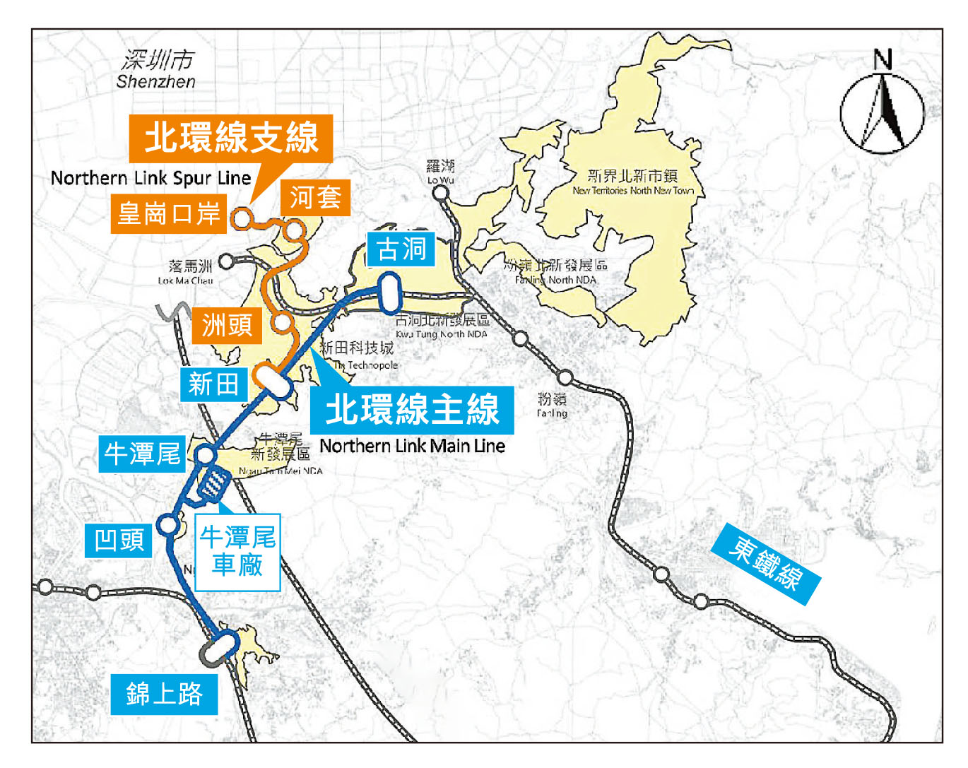 行政長官會同行政會議昨日批准北環線項目第一部分的財務安排,運輸及物流局與港鐵隨後簽訂有關項目協議,確立北環線主線項目部分融資及建造安排,同時啟動支線的詳細規劃及設計,包括採用「鐵路加物業」發展模式,並將兩線合併作為一個項目進行規劃,以期將支線提早兩年至不遲於2034年與主線同步完成工程。北環線支線日後將直接連通港深兩地地鐵網絡,接入新皇崗口岸並提供便捷的「一地兩檢」通關模式。預料北環線通車後,錦上路至古洞的行程大幅縮短至約12分鐘。
