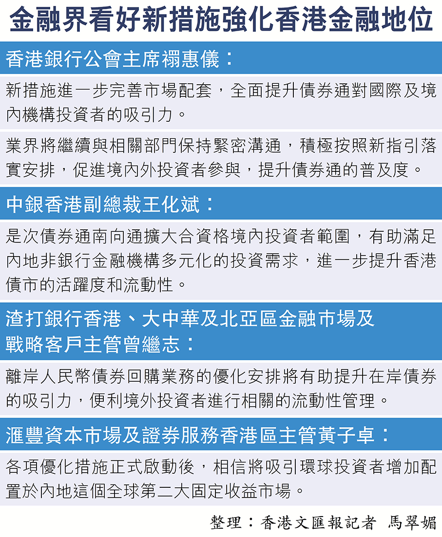 債券通開通8周年,中國人民銀行昨日在債券通周年論壇上宣布三項重磅開放措施(詳見另表),最矚目是完善債券通南向通運行機制,擴大境內投資者範圍至券商、基金、保險、理財等四類非銀行機構,意味將有更多「北水」南下投資,同時亦優化債券通離岸回購業務機制安排、優化互換通運行機制。分析認為,新措施不僅便利內地資金更暢通「南下」投資,在進一步滿足投資者利率風險管理需求下,更有望讓國際資本透過香港這個「超級聯繫人」,更靈活地投資人民幣資產。 ●香港文匯報記者 曾業俊、周紹基