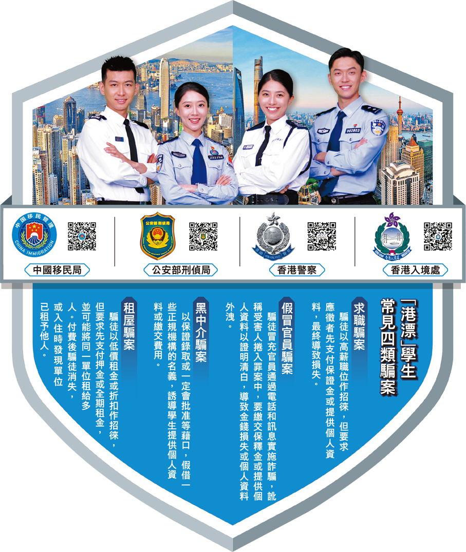 另外,香港警方反詐騙協調中心與國家教育部留學服務中心合作,上月10日在瀋陽市舉辦首場線上線下分享會,向超過1萬名有意來港升學的學生及其家長宣講防騙知識。另外,會經本地各大專院校及內地留學服務中心,向來港升學的學生及其家長發出由香港警務處處長周一鳴簽署的信函,向「港漂」學生和家長提供防騙貼士及獲取支援的方式(見另稿)。