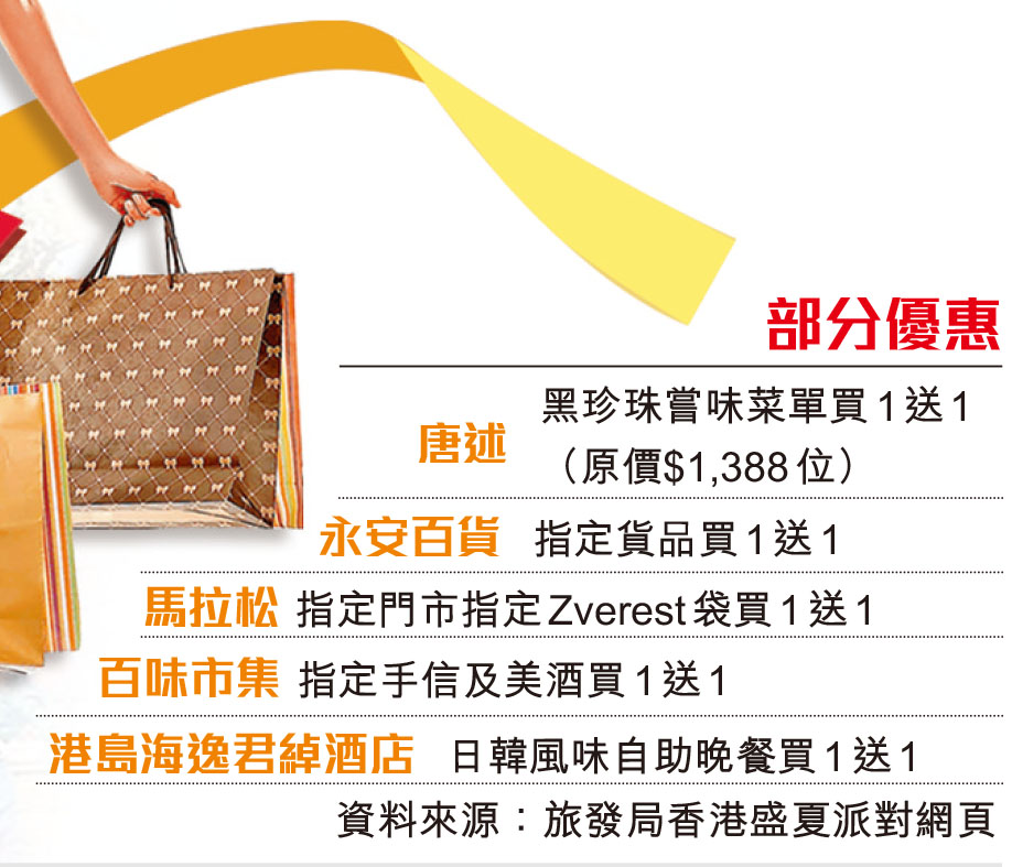 香港旅遊發展局夏季主題推廣「香港盛夏派對」攜手本地旅遊相關業界,自上月中下旬起已為市民及旅客推出多項夏日禮遇及消費優惠。由於活動持續獲城中不少商戶鼎力支持及響應,一同推動盛夏消費,至今禮遇及消費優惠總數已由約150項增至逾260項,大部分禮遇及消費優惠的領取或使用限期至下月31日,涵蓋餐飲、零售、酒店住宿、景點、公共交通、觀光旅遊等。包括景點門票買2送1、超過100間本地酒店亦繼續提供自助餐買1送1或住宿優惠等。