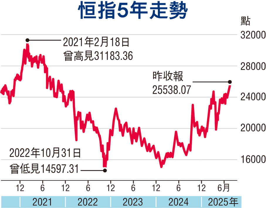 外電報道,美國總統特朗普表示他「可能在不遠的將來」訪華;此外,國家商務部昨日公布,經中美雙方商定,國務院副總理何立峰將於7月27日至30日赴瑞典與美方舉行經貿會談。市場憧憬中美關係將持續改善,大量買盤流入港股,當中以科技股最突出,科指升2.5%,收報5,745點。恒指亦以全日最高位25,538點報收,再創逾3年半新高,升408點或1.6 %,成交急增至3,332億元。至此,恒指連升4個交易日,累升1,039點,瑞銀、景順等機構繼續唱好後市。 ●香港文匯報記者 周紹基
