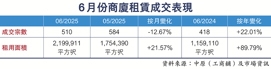 6月底整體寫字樓空置率維持於13.6%,兩個分區市場錄得空置率改善。港島東及九龍東的空置率分別回落至13.6%及20.7%。相比之下,中環及灣仔/銅鑼灣的空置率分別上升至11.8%和9.5%。此外,美資投行於6月破天荒以約3,061萬元承租恒基旗下的中環新海濱三號一期,對商廈租賃市場有正面推動作用。在多宗大額租賃成交帶動下,商廈租賃宗數表現按年錄得升幅。